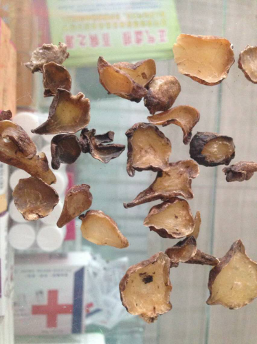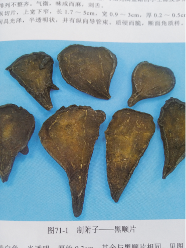 3、附子:颜色乌黑、口尝毫无麻味的,是炮制过度的掺假品,系将黑顺片加入粘合剂后再加入泥沙,以增加重量的。90%以上的药店卖此种附子。