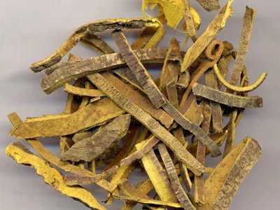 7、黄柏:正品是川黄柏,关黄柏也可以用。我见过用其他树皮加染料染成黄色的伪品,用手掰开,里面是白色的,尝之无苦味。(据说有用番薯的块根做的伪品,外形呈不规则片状或丝状,厚度比真品薄,人工染成黄色,表面光滑,无纵沟纹;质脆,断面呈粉性,浅黄色;闻之亦气微,但口尝味淡不苦,还略带甜味。)